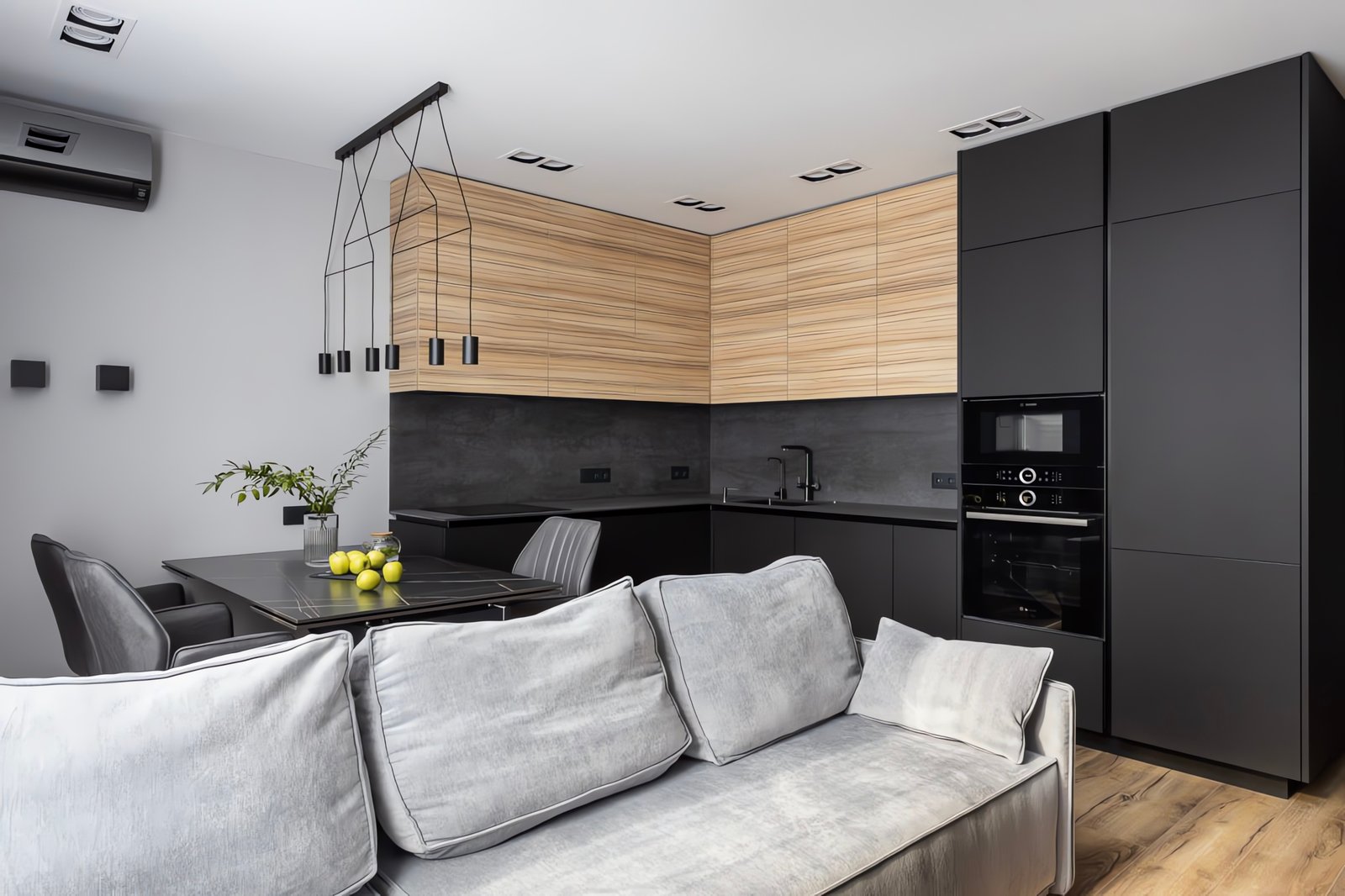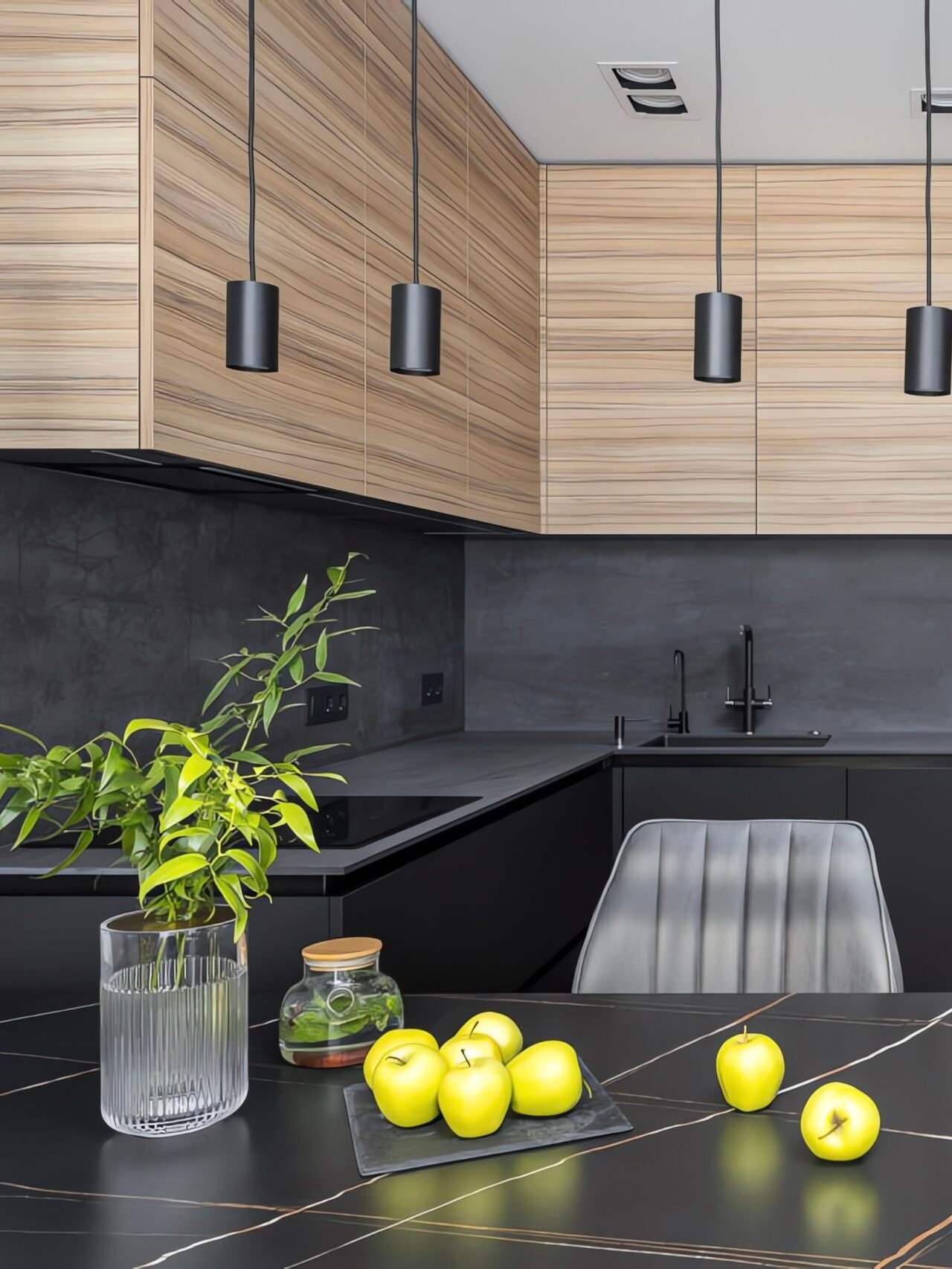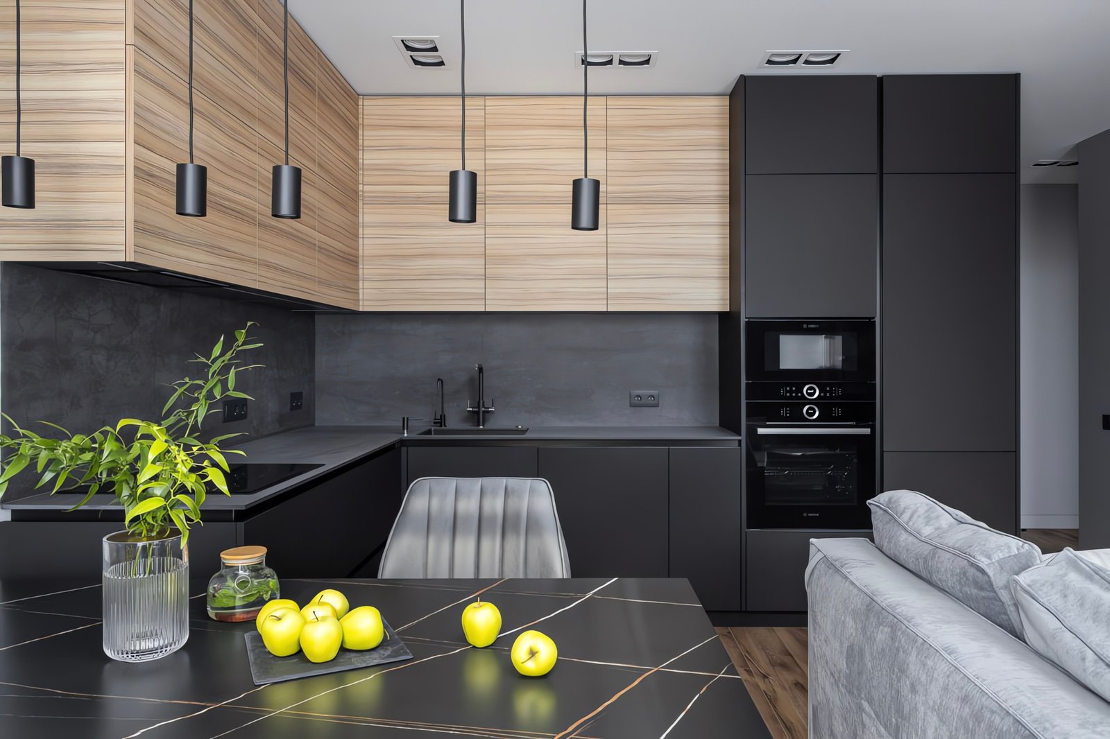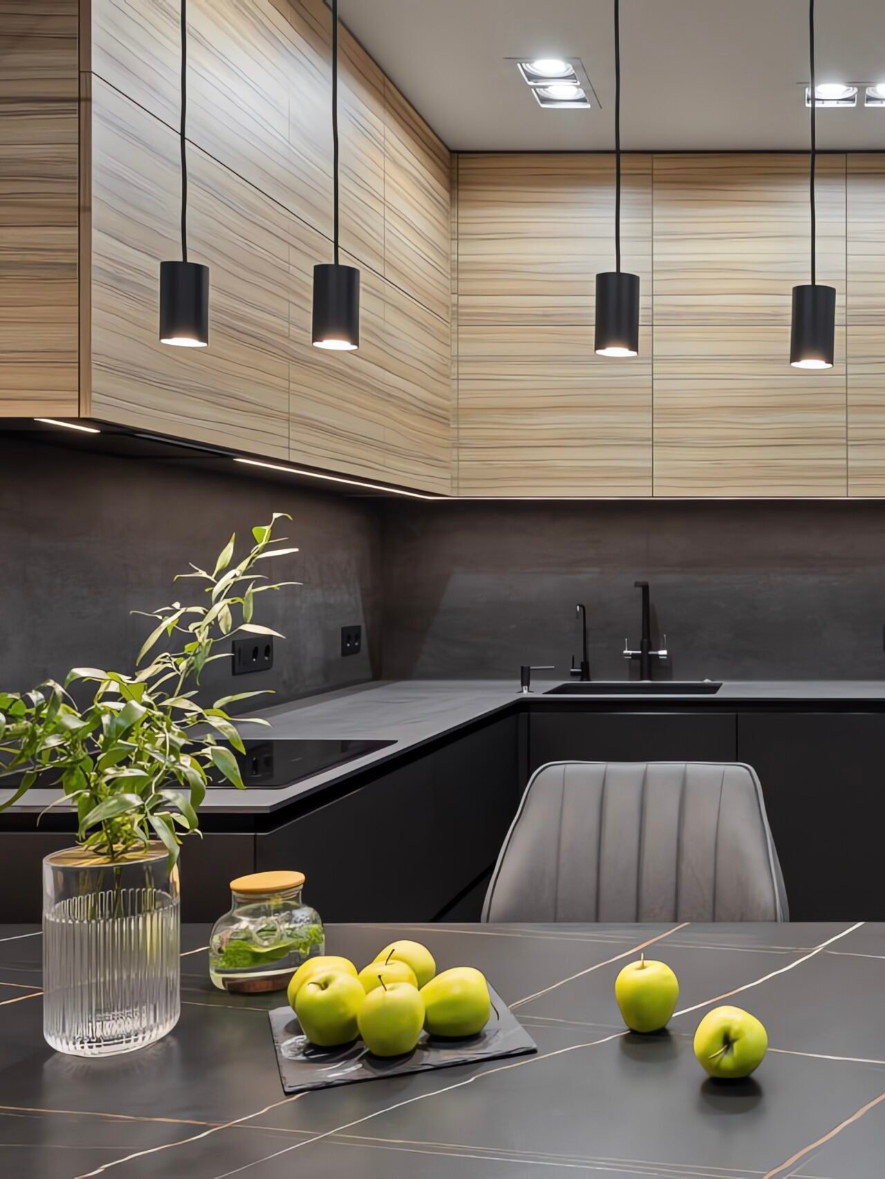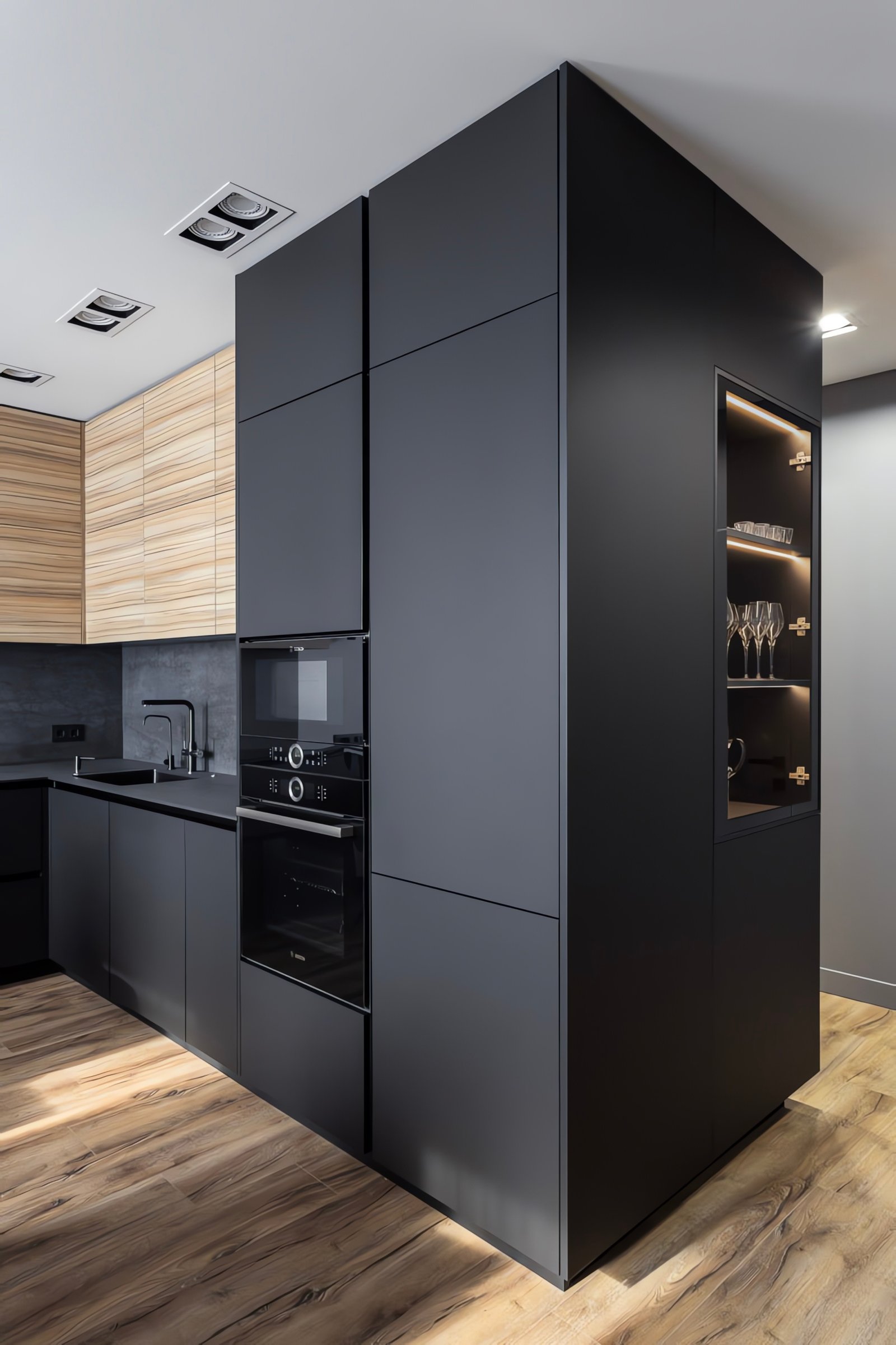Moderne L-Küche in mattem Dunkelgrau mit markanten Zebrano-Holzmaserung-Oberschränken, schwarzer Steinarbeitsplatte und beleuchteter Glasvitrine. Einbaugeräte, schwarze Pendelleuchten und durchdachte Stauraumlösungen inklusive.