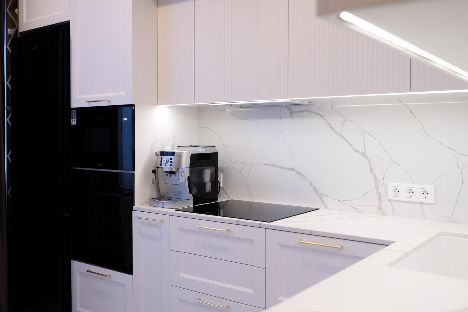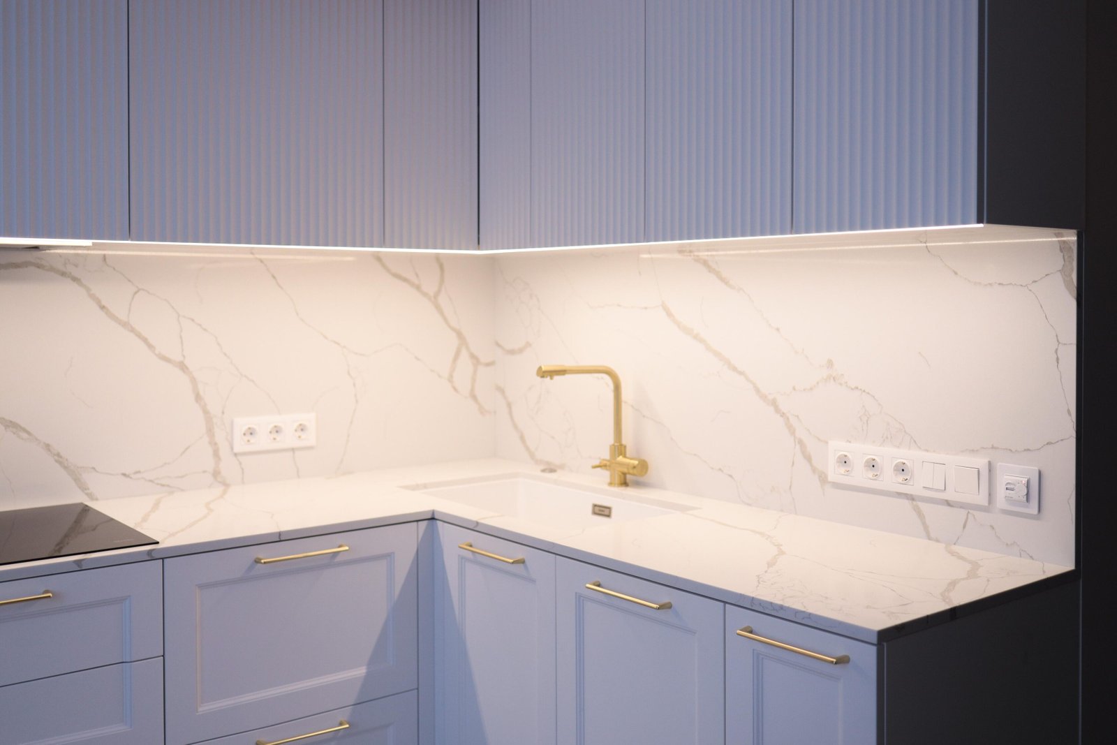 Quarz-Arbeitsplatte und Calacatta-Rückwand