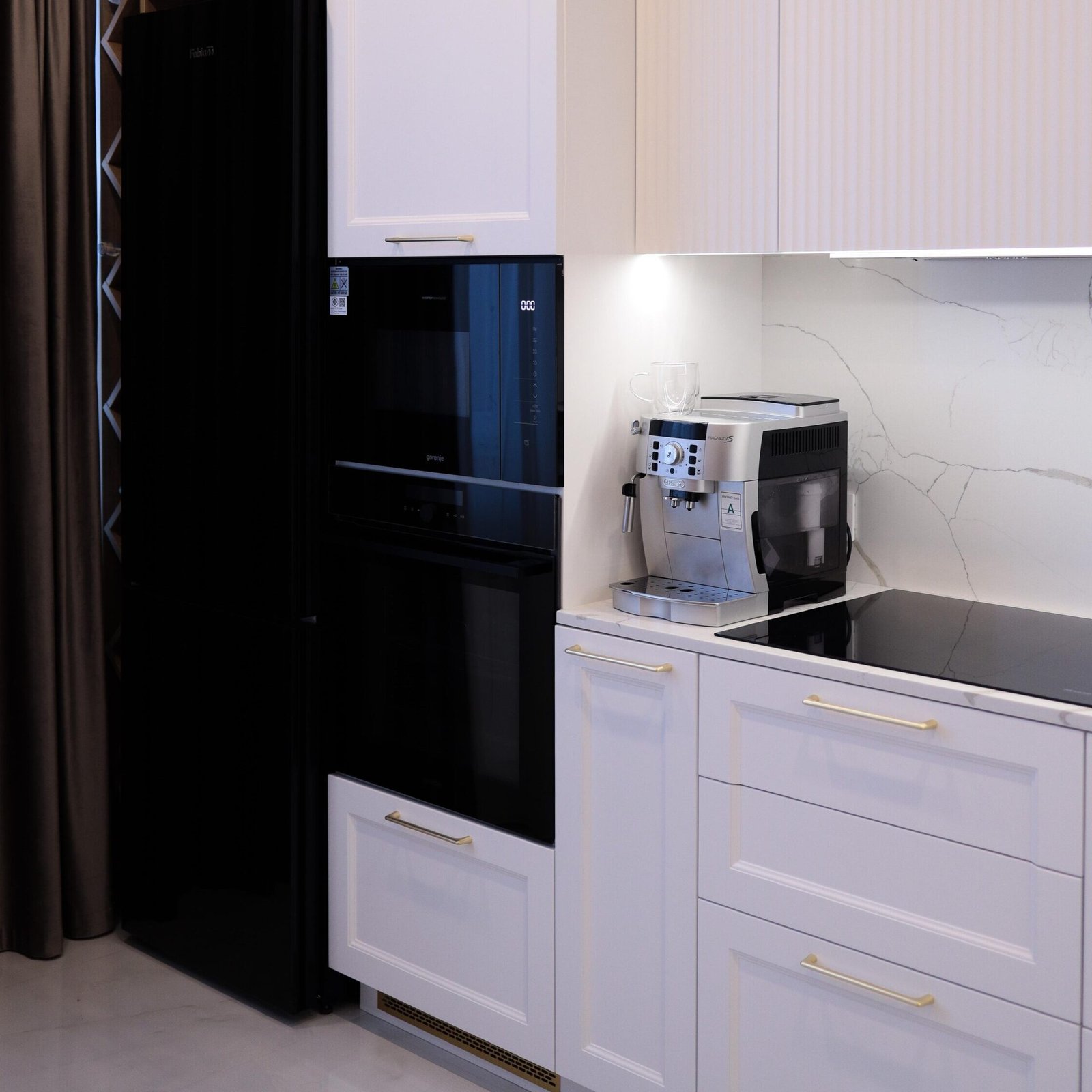 Die großzügige Quarz-Arbeitsplatte (30 mm) in strahlendem Weiß harmoniert perfekt mit der Calacatta-Marmor-Rückwand. Der Korpus besteht aus Egger-Spanplatte (18 mm). Die Oberschränke mit Aluminiumrahmen und Klarglas-Einsätzen in gebürstetem Gold bieten stilvollen Einblick und dienen als beleuchtete Vitrinen.