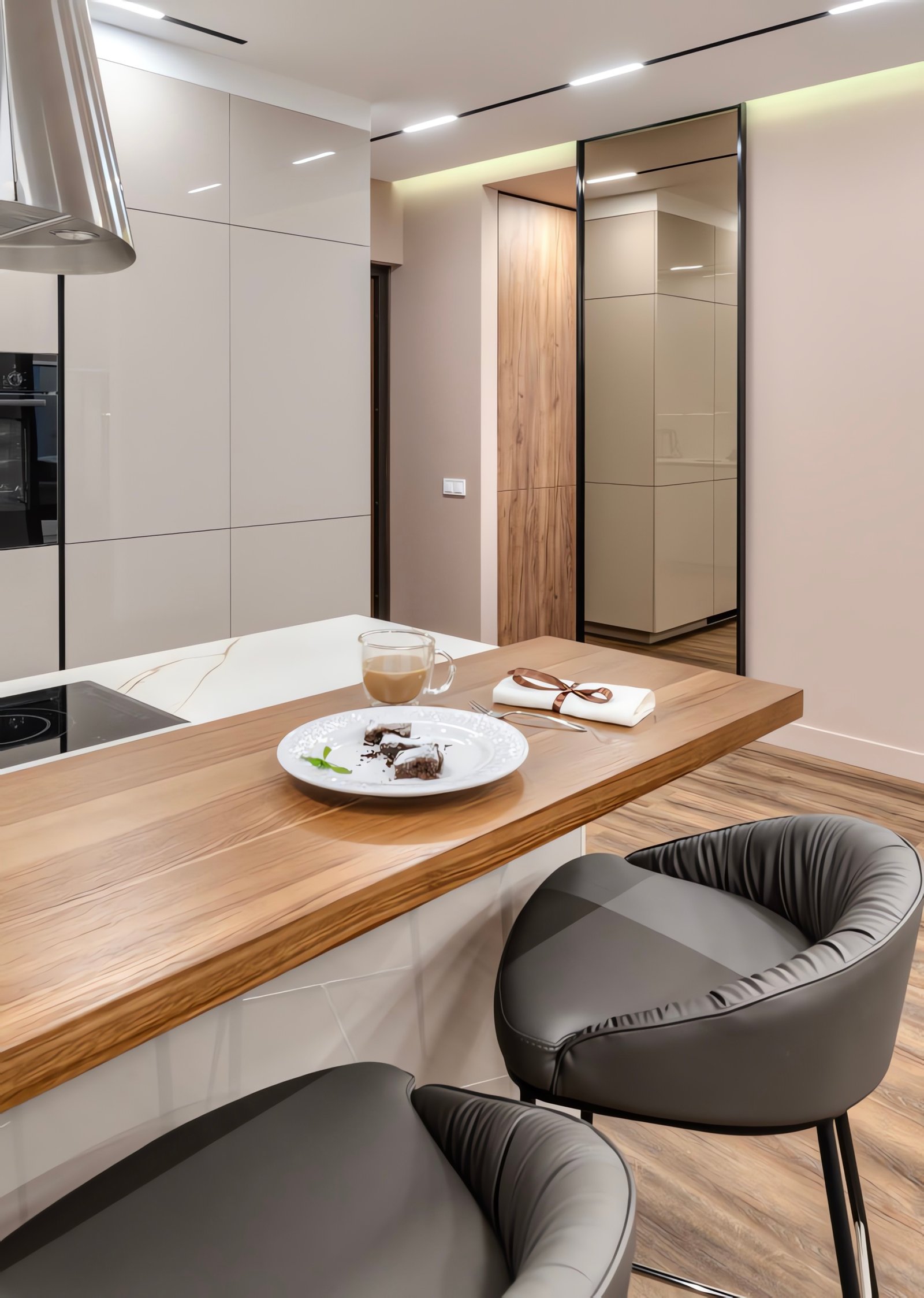 Die großzügige Kochinsel mit integriertem Kochfeld bietet reichlich Arbeitsfläche und Stauraum. Die angeschlossene Massivholz-Theke mit hochwertigen Barhockern schafft einen gemütlichen Essbereich für den Alltag.