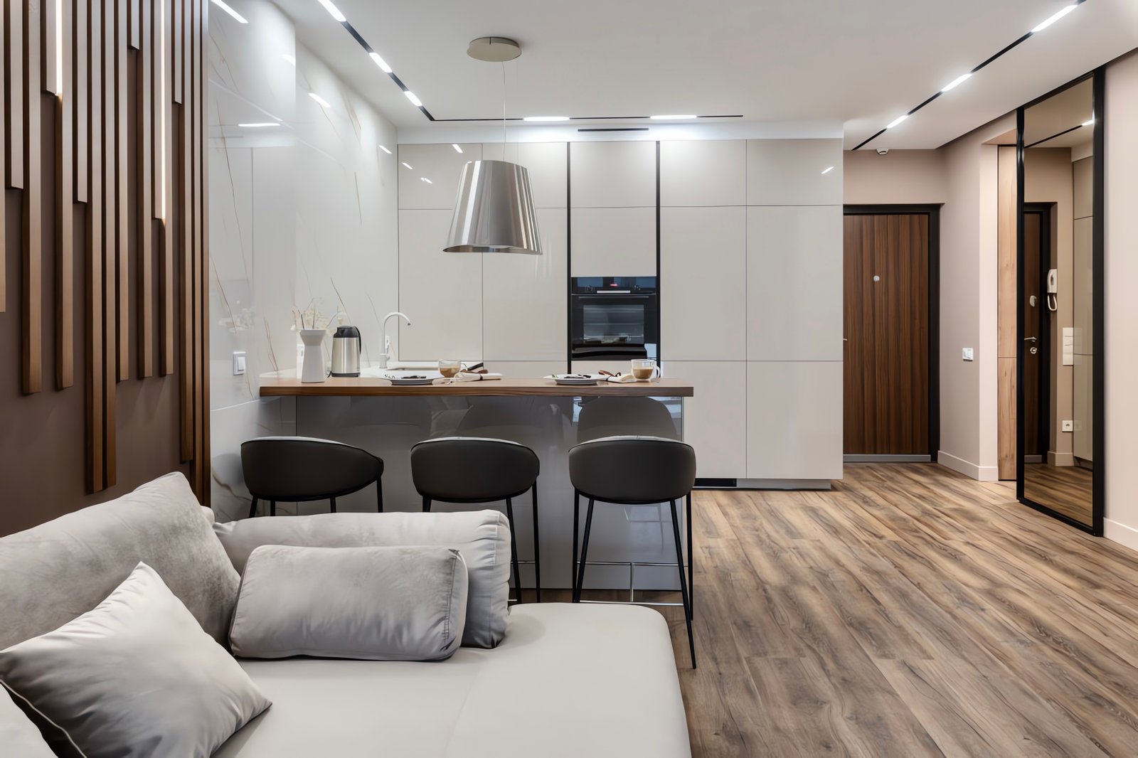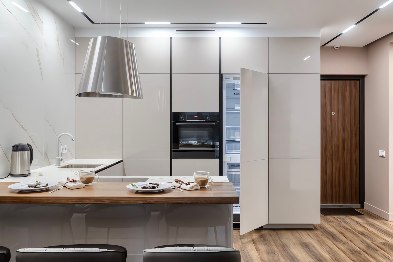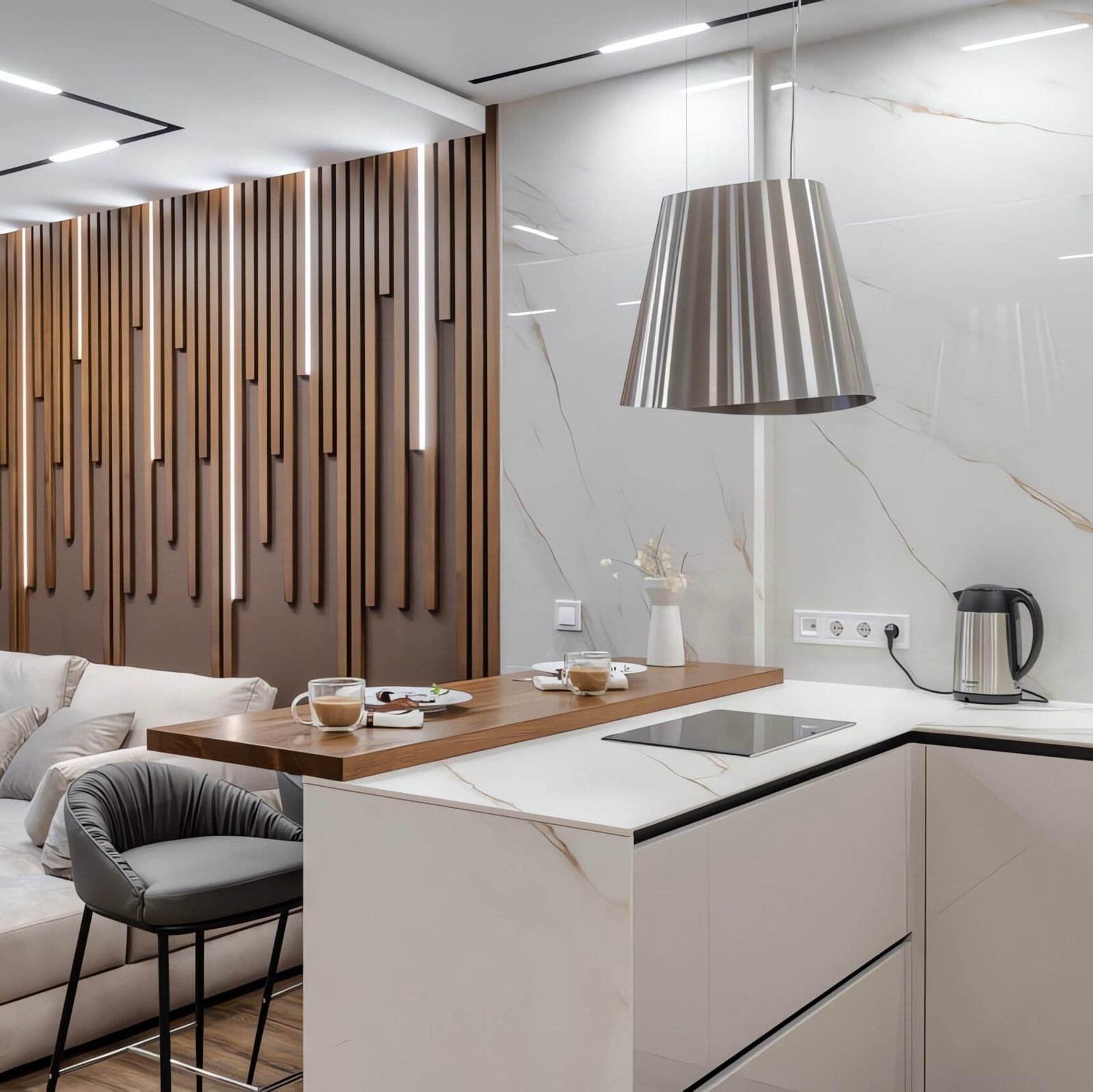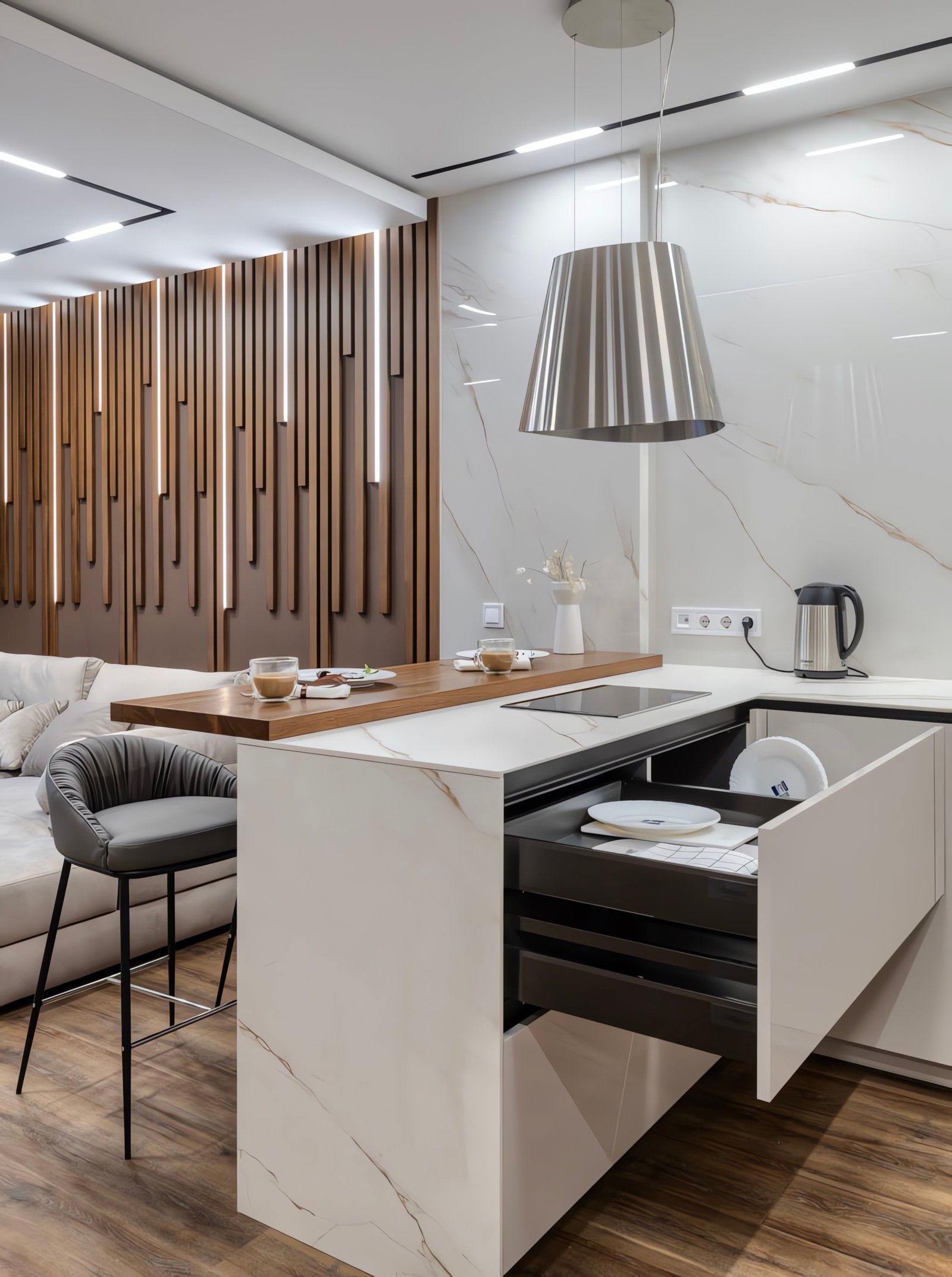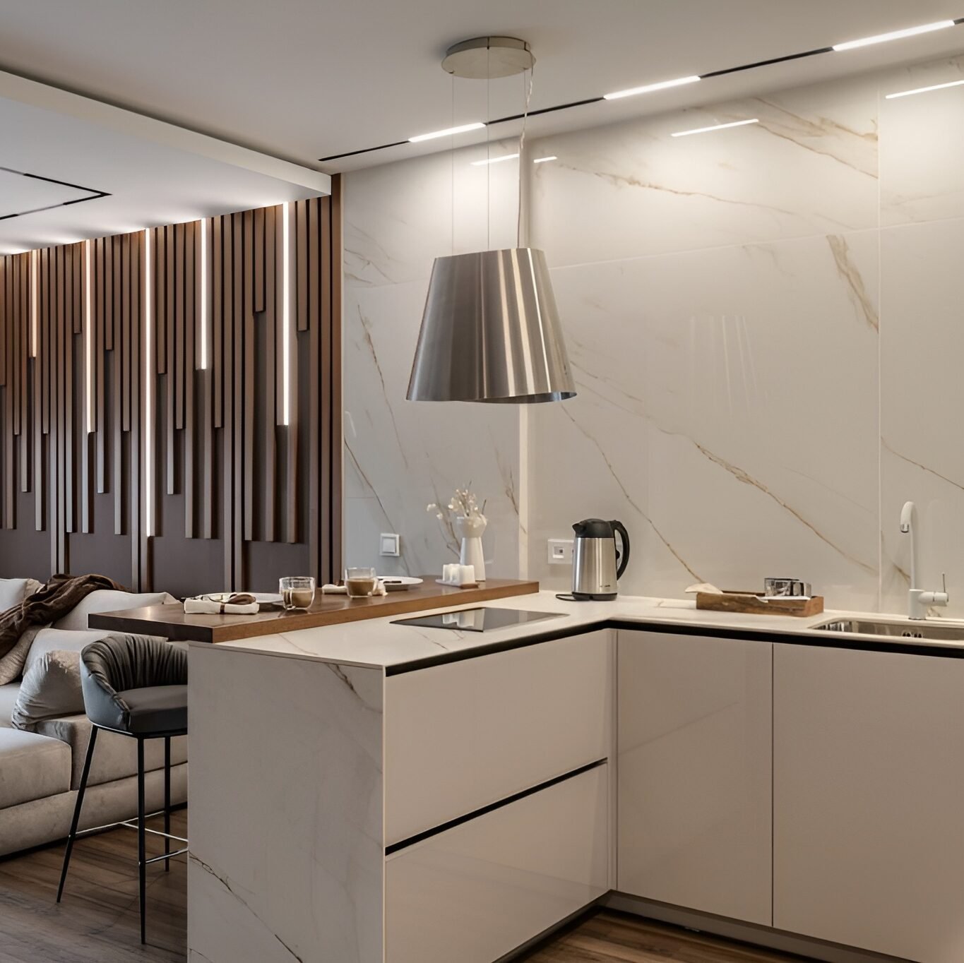 Die grifflosen Fronten in Weiß-Hochglanz werden durch eine beeindruckende Rückwand und Kochinsel in Calacatta-Marmor-Optik ergänzt. Das Herzstück des Raumes bildet die dekorative Holzlamellen-Akzentwand mit integrierter LED-Hintergrundbeleuchtung, die dem Raum Tiefe und Wärme verleiht.