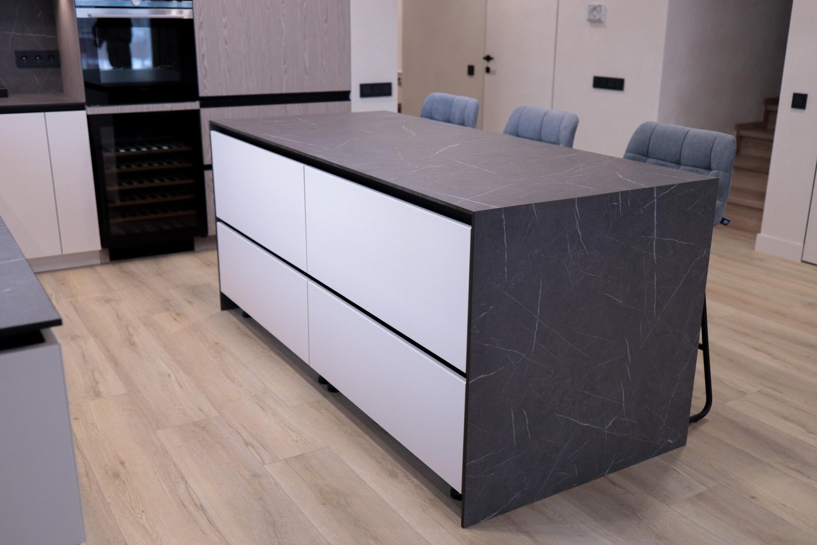 Das Herzstück der weißen Mattküche ist die Kochinsel mit Keramikplatte (12 mm) von Laminam in Pietra-Grey-Marmor-Optik. Die Waterfall-Kante — bei der die Platte nahtlos über die Seite fließt — erzeugt ein skulpturales Designelement. Darunter verbergen sich großzügige Schubladen und ein integrierter Weinkühlschrank.