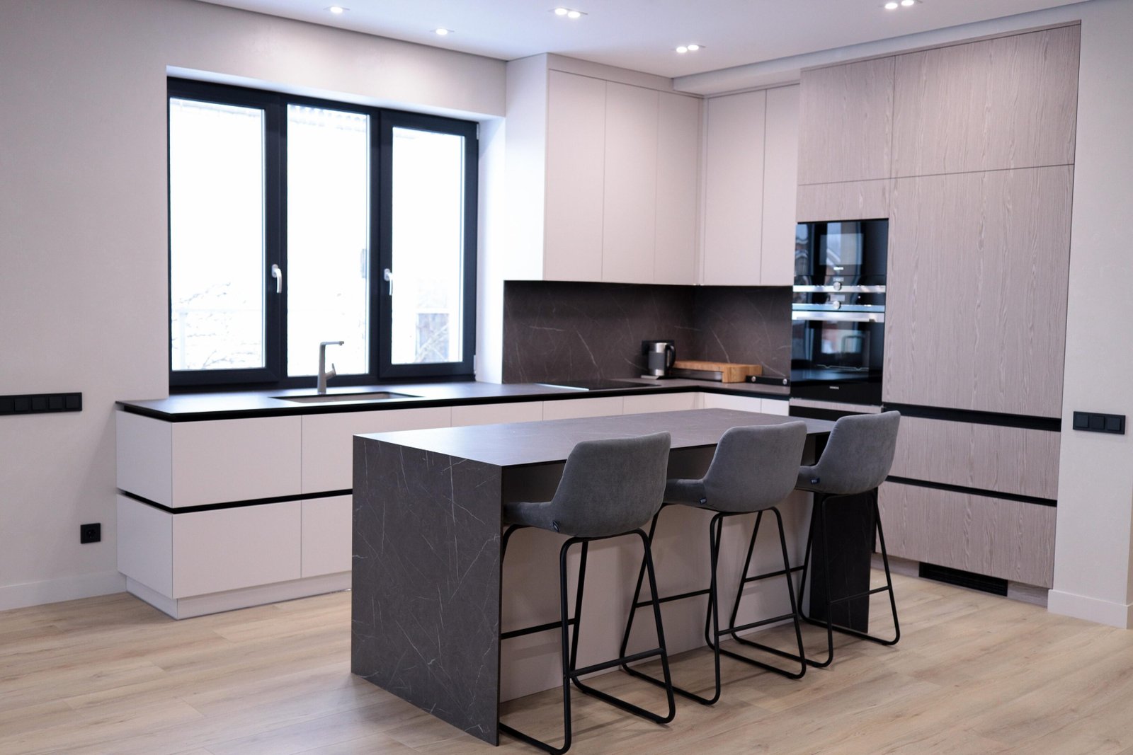 Die raumhohen Hochschränke in heller Eichen-Holzstruktur (Egger-Spanplatte) bringen Wärme in die sonst kühle Farbpalette und schaffen eine Balance zwischen modern und wohnlich. Backofen und Dampfgarer sind auf ergonomischer Höhe integriert. Die schwarze Unterbauspüle mit passender Armatur und die schwarzen Fensterrahmen setzen konsequente Farbakzente.