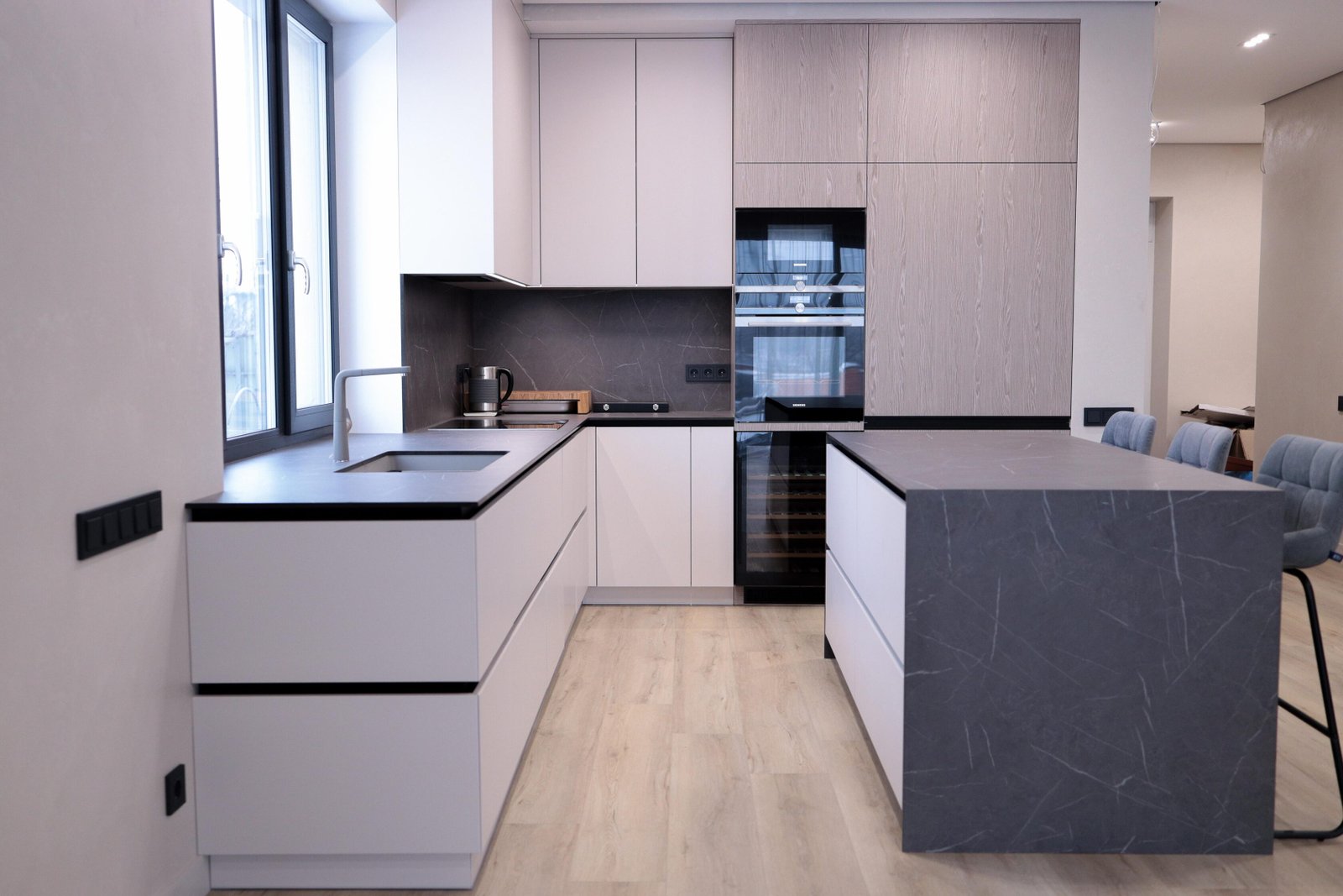 Puristische Wohnküche in Weiß matt mit Kochinsel in Pietra-Grey-Keramik (Waterfall-Kante), Hochschränken in heller Eichenstruktur, Weinkühlschrank und schwarzen Einbaugeräten. Inklusive professioneller Montage.